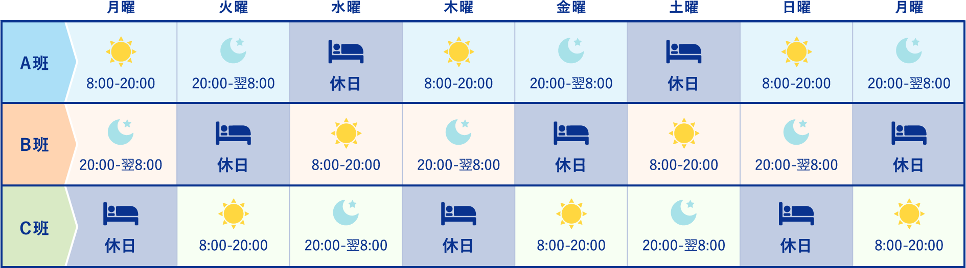 3班にわかれて昼勤・夜勤を2交替で行います。各班6人体制で、休み(公休)をとりながら昼勤・夜勤を繰り返します。1ヶ月の労働時間は143~176 時間になる為(8 時間勤務者とほぼ同等)、出勤は 1ヶ月に概ね13~16回になります。工場を停止させる場合(GW・盆・年末年始)は長期休みになります。